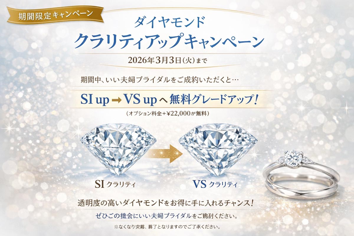 期間中、いい夫婦ブライダルをご成約いただくと、センターダイヤモンドのクラリティグレードを無料でグレードアップいたします。
